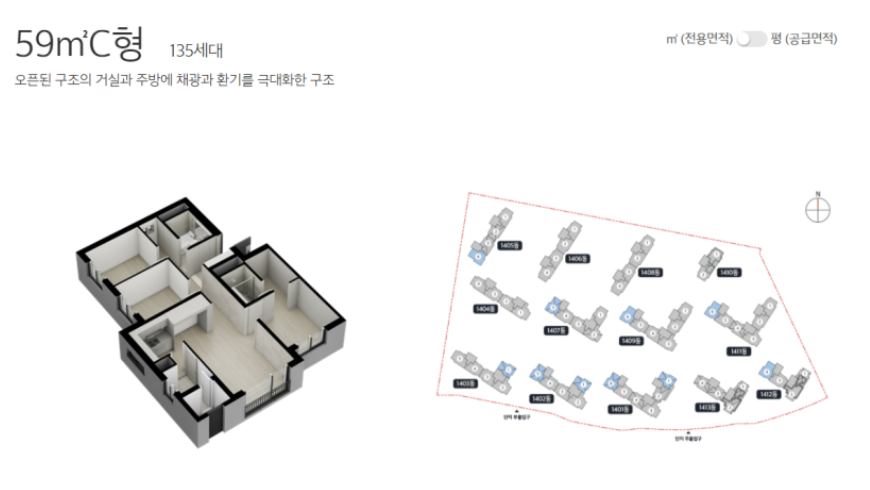 | 59㎡ C타입 | 1402동 505호 | 366,828,000원 | 36,682,800원 (10월 25일 납부) | 330,145,200원 (12월 23일 납부) |